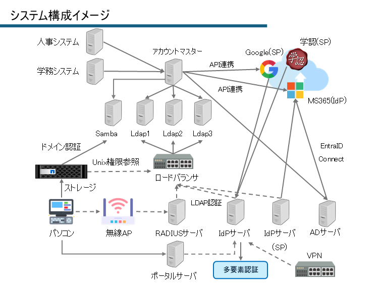 SAML認証に対応しているShibboleth-IdPと多要素認証を組み合わせることにより、VPN装置の認証に対しても組織内のアカウントを用いて多要素認証を提供することができます。